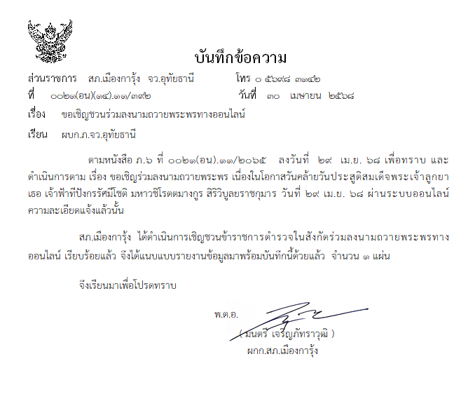 สำนักพระราชวัง ขอเชิญชวนร่วมลงนามถวายพระพรทางออนไลน์ เนื่องในโอกาสวันคล้ายวันประสูติสมเด็จพระเจ้าลูกเธอเจ้าฟ้าทีปังกรรัศมีโชติ มหาวชิโรตตมางกูร สิริงิบูลยราชกุมาร วันอังคารที่ 29 เม.ย.68 ที่เว็บไซต์หน่วยงานราชการในพระองค์ www.royaloffice.th ระหว่างวันที่ 28-30 เม.ย.68 สำหรับหน่วยงาน/ที่อยู่ ให้ใส่ “สำนักงานตำรวจแห่งชาติ” นส.แจ้งหน่วยระหว่างดำเนินการ ครับ