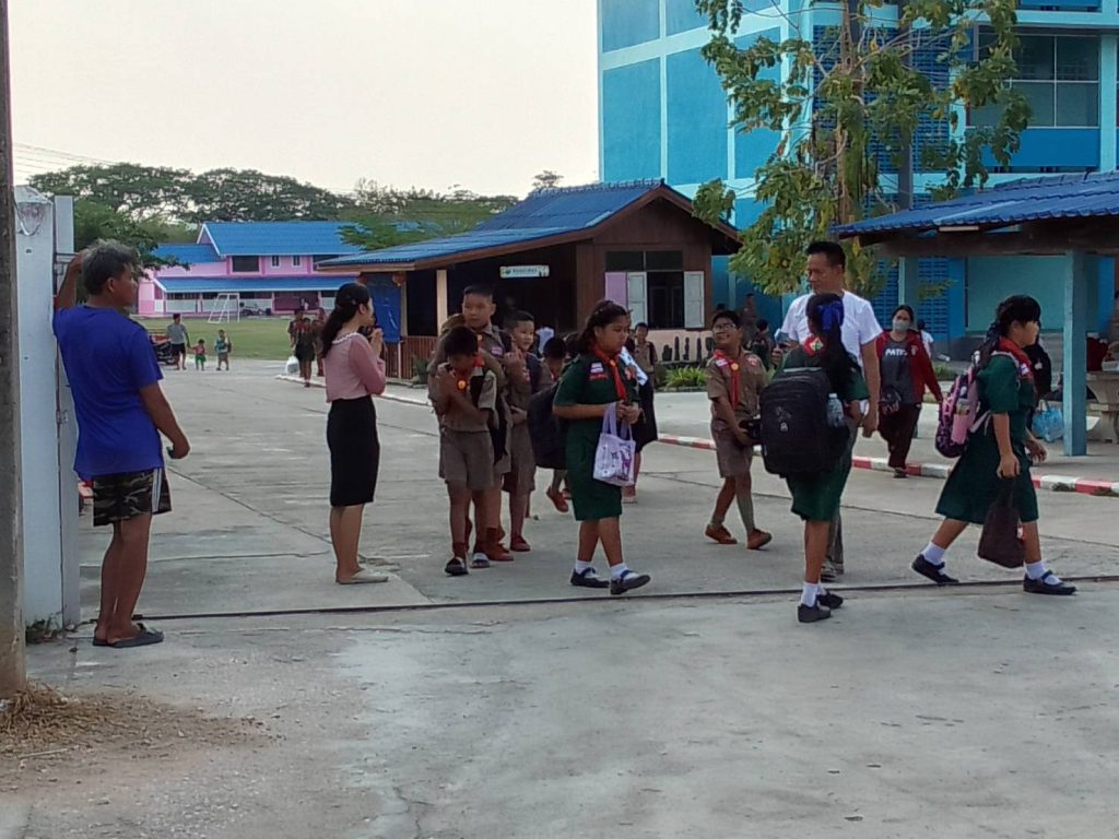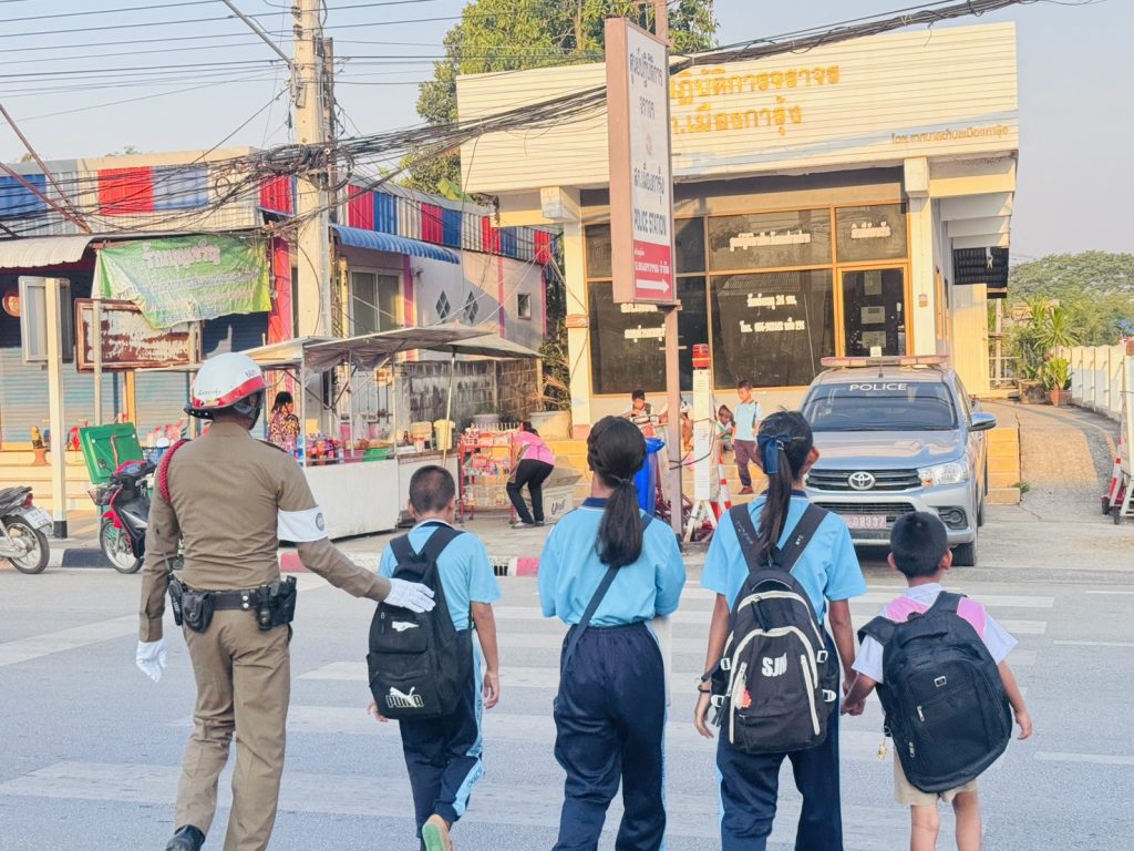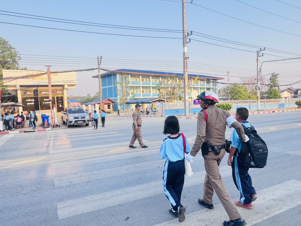 พร้อมกันดูแลการจราจรหน้าโรงเรียนชุมชนบ้านเมืองการุ้ง